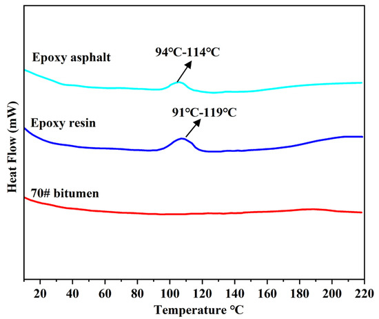 DSC curves of the matrix asphalt, epoxy resin, and epoxy bitumen.