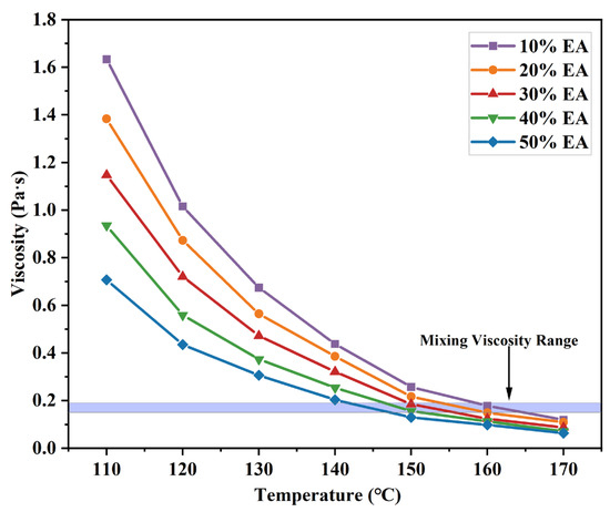 Viscosity is an important parameter in measuring asphalt as it is important in curing, machining, blending, compaction, and supplying. EA variation with temperature at different dosages is shown in Figure 11. EA viscosity decreases with an increase in addition because epoxy resin is less viscous than asphalt, and the addition of epoxy resin at the beginning of the reaction decreases EA viscosity. Generally, asphalt is mixed at a viscosity of 0.17 Pa∙s ± 0. 02 Pa∙s. The optimum EA dosage of 40% was determined above, and the temperature was 146–153 °C at 0.17 Pa∙s ± 0.02 Pa∙s, so 150 °C was chosen as the stirring temperature.