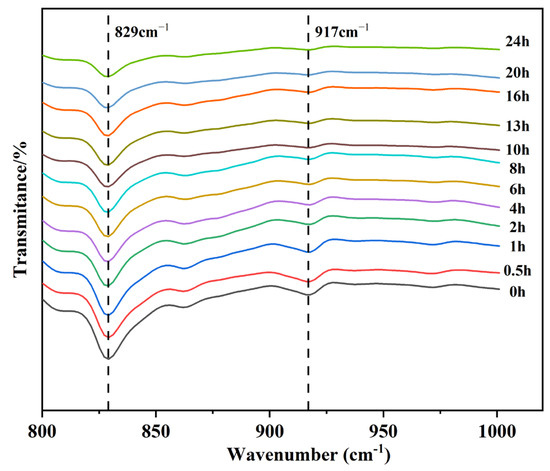 In this paper, FILT is used to characterize the curing behavior of EA at 120 °C. The test results are shown in Figure 13. The epoxy group (917 cm−1) and benzene ring (829 cm−1) are characteristic peaks unique to epoxy resins and not found in asphalt. It was shown that the characteristic benzene ring peaks do not participate in the reaction during the curing process. The curing behavior of 40% EA was analyzed using Equations (1) and (2). The results of the calculations are shown in Figure 14.