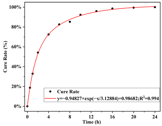 At 120 °C, the curing behavior of 40% EA is divided into three phases: 0–4 h for accelerated curing, with 69% of the reaction complete; 4–12 h for sustained growth, with 95% of the reaction complete; and after 12 h for slow curing.