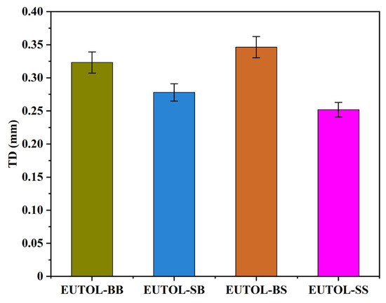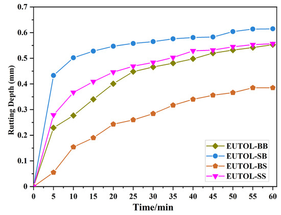 This study analyzes EUTOL’s high temperature performance using a high temperature rutting test at an experimental temperature of 60 °C. In order to better match the road surface condition, a layered structure was used in this experiment, with 3 cm of AC-13 basalt selected for the lower layer and 2 cm of EUTOL selected for the upper surface. The test results are shown in Figure 17. EUTOL deformations at 60 min were in descending order of EUTOL-BS > EUTOL-BB > EUTOL-SS > EUTOL-SB. It showed that using steel slag fine aggregate increased EUTOL rutting depth, while using steel slag coarse aggregate decreased EUTOL rutting depth.