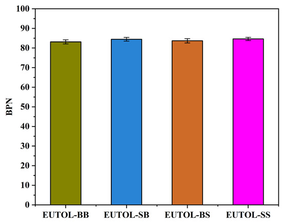 The Texture Depth Test (TD) and British Pendulum Number Test (BPN) of this pavement are two indicators of the skid resistance of asphalt pavements, which are related to the safety of driving and have an essential influence on the use of the pavement and are related to the roughness, skid resistance, and drainage performance of the pavement. Therefore, TD and BPN are chosen to characterize the skid-resistance durability of EUTOL in this paper. The test results are shown in Figure 15 and Figure 16. The TD of the four EUTOLs, from largest to smallest, is EUTOL-BS > EUTOL-BB > EUTOL-SB > EUTOL-SS. The results show that replacing basalt fine aggregate with steel slag fine aggregate decreases the TD of UTOL. This is mainly due to the higher proportion of powder particles smaller than 0.15 mm in steel slag fine aggregate compared to basalt fine aggregate. Although the effect of aggregate substitution can be reduced by using volumetric substitution, the fine aggregate is made up of multiple grades of aggregates, which will cause a slight effect. Despite this, the differences between the four EUTOLs are only within 0.1 mm. As depicted in Figure 16, the BPN of the four EUTOLs follows a descending order: EUTOL-SS > EUTOL-SB > EUTOL-BS > EUTOL-BB. This is attributed to steel slag aggregates’ better angularity and abrasion resistance than basalt aggregates. The rough surface texture of steel slag aggregate also contributes to increased roughness and distinct surface abrasion, further enhancing the BPN.