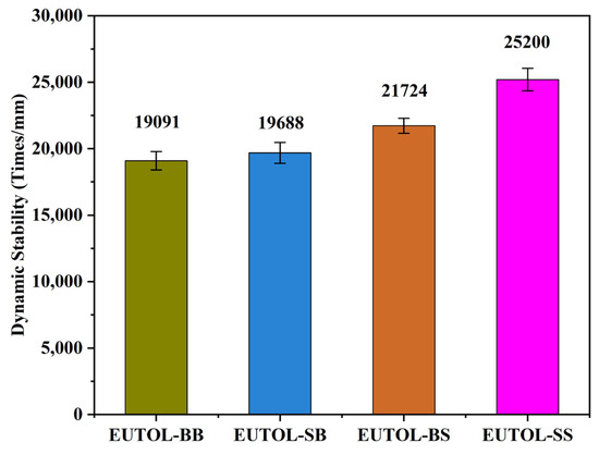 This is because the roundness of steel slag fine aggregate is larger than that of natural aggregate, and the fine-grained steel slag will form a more compact skeleton structure in one step and undergo greater deformation under external extrusion. In contrast, the steel slag coarse aggregate particle shape is irregular and multi-angled, with high internal friction between aggregates, making forming a mutually embedded skeleton support structure easy. The dynamic stability of the four EUTOLs is EUTOL-SS > EUTOL-BS > EUTOL-SB > EUTOL-BB in descending order, as shown in Figure 18. EUTOL’s high-temperature characteristics can be enhanced by substituting steel slag for basalt. Steel slag is complex, has a porous surface, and is alkaline, so it binds well to EA. And it is hard. However, the smallest EUTOL-BB also achieved dynamic stability of 19,091, indicating that EUTOL prepared using EA has good high-temperature performance.