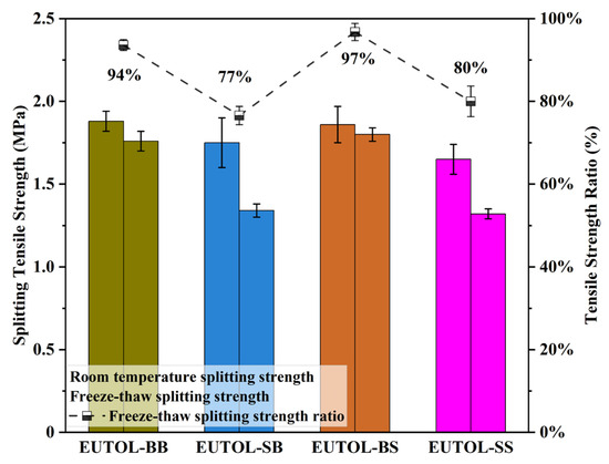 The splitting strength and freeze–thaw splitting ratio of different ETOULs.