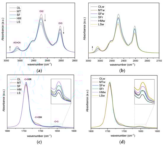 FTIR-ATR spectra recorded for fresh (left) and wasted (right) oils for 1600–1900 cm−1 (a,b) and 2800–3050 cm−1 (c,d) regions.