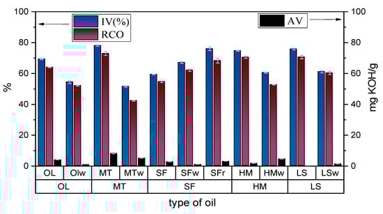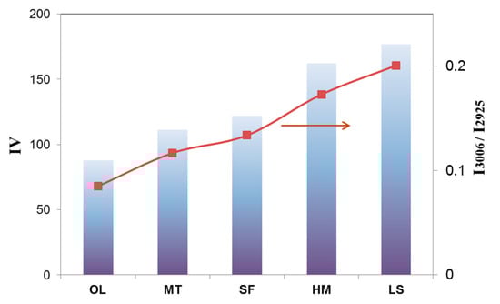 Figure 2 represents the IV of the fresh oils. Additionally, IV, estimated by FTIR-ATR analysis using the ratio of the band intensities A3006/A2925, as previously reported [], shows the same unsaturation trend as reported in the literature (Table 3). A lower IV suggests lower unsaturation.