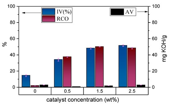 Different concentrations of the enzyme catalyst (NZ) were tested in the proposed system. The epoxidation results correlated with the biocatalyst concentration are shown in Figure 3. It can be observed that increasing the loading of the biocatalyst from 1.5 wt% to 2.5 wt% led to the increased acidity of the samples, without significant changes in the double bond epoxidation. Therefore, the 1.5 wt% NZ was further used. This is in accordance with the literature data (1–7 wt% of the enzyme catalyst for biocatalytic epoxidation of oleic acid and tall oil) [].