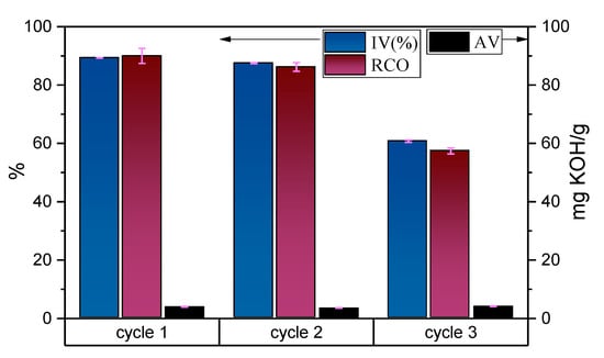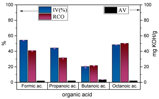 Four different organic acids (formic, propanoic, butanoic and octanoic acids) were tested for the biocatalytic epoxidation of the SFr sample. The results are summarized in Figure 4. In the presence of formic acid, more than 50% of the ethylenic bonds are converted (54.2 IV(%) and 40.6 RCO(%)). Despite the good result obtained in the presence of formic acid and the advantage of its easier elimination from the reaction mixture, a significant build-up pressure was observed due to the decomposition of formic acid in CO2. The difference of about 10% between the IV(%) and RCO(%) values also suggests that further side reactions occurred at the formed epoxide. Therefore, alternative acids, such as propionic, butyric and octanoic acids, were tested, too (Figure 4). The experimental results demonstrated that the increase in the length of the acid chain led to an increase in the conversion of the epoxidation process. Octanoic acid allowed for obtaining the maximum conversion for the sample epoxidation (48.3 IV(%), 50.1 RCO(%)), without modifying the system pressure, as noticed before with formic acid. This confirms that the octanoic acid can be successfully used as an “in situ” peracid source in the biocatalytic system of the epoxidation process. Similar results were previously reported in the literature [].