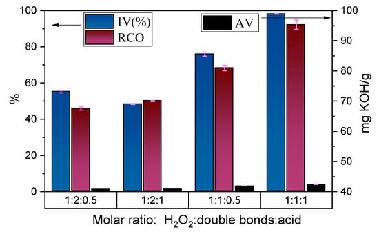Relative conversion to oxirane (RCO %) was calculated using the relationship (8), where OOCexp is the experimental oxiranic oxygen content [,].