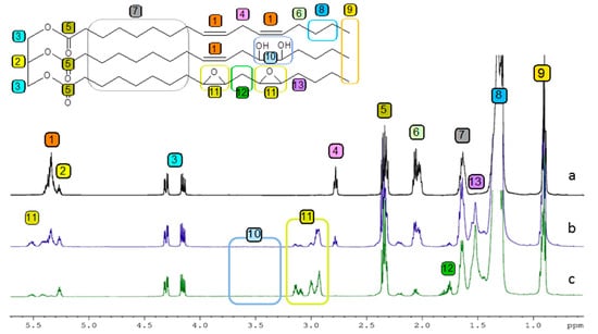 The enzymatic epoxidation of SFr was performed for two different reaction times (6 h and 12 h). The 1H NMR analysis of the samples after epoxidation allowed for the monitoring of the epoxidation process (Figure 6). The intensity of specific signals at 5.3 ppm (1), corresponding to protons of double bonds and protons of CH2 groups (4, 6), situated between and next to double bonds, decreases during the epoxidation reaction (Figure 6a–c). At the same time, new signals, specific for protons of the epoxide ring in the range of 2.9–3.2 ppm (Figure 6b,c—(11)), together with new signals of CH2 group between and adjacent to epoxides (Figure 6b,c—(12, 13)) confirm a successful epoxidation. Moreover, no signals (10) attesting to epoxide ring opening and hydroxyl formation were detected. A slight decrease in the signals corresponding to the protons from the glycerol chain (2, 3) suggests a partial hydrolysis of glycerides to free fatty acids (Figure 6b,c) []. In conclusion, 12 h is the best reaction time in terms of achieving performant epoxidation of the sample and minimizing undesirable reactions, such as oxirane ring opening and hydrolysis of triglycerides.