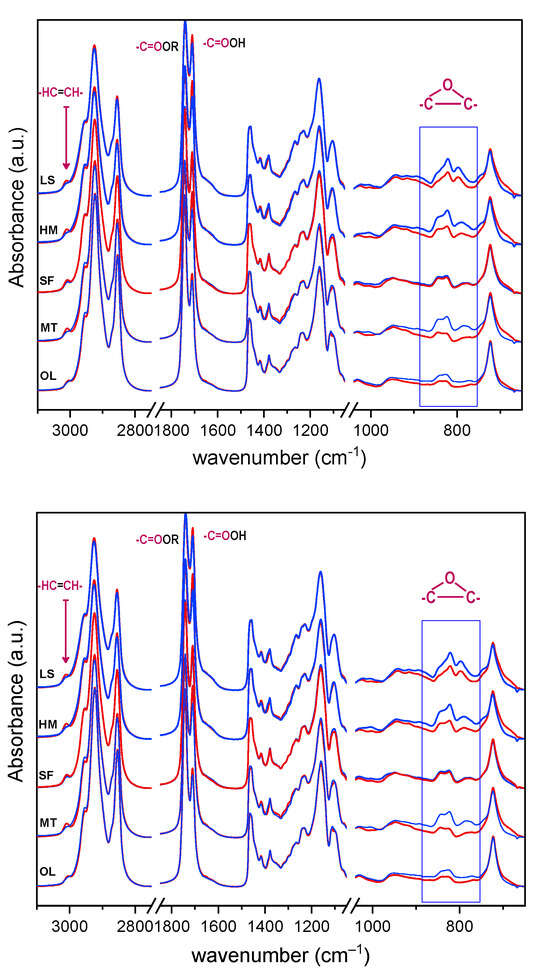 FTIR (Fourier Transformed Infrared Absorption Spectroscopy) spectra were obtained using a Perkin Elmer spectrometer, Hamburg, Germany with an ATR (Attenuated Total Reflection) cell equipped with a diamond crystal, in the spectral range of 4000–400 cm−1, with a resolution of 4 cm−1 and a number of 32 scans, at room temperature. The oil samples were analyzed directly, without any pretreatment, by placing the liquid sample on the crystal and recording the spectrum. After each measurement, the crystal was cleaned with acetone and ethanol to remove all the traces of the measured oil. For the estimation of the unsaturation degree of the sample, FTIR-ATR spectra were subsequently processed using Origin 8.5 software. Spectra were deconvoluted using a Lorenz function, after an initial base line correction [].