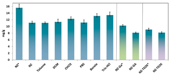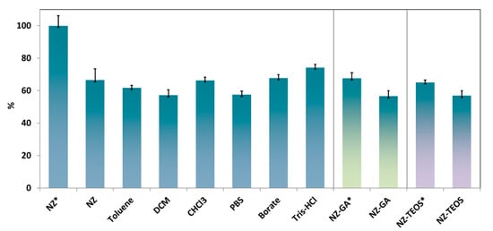 NZ covering with silica was performed as follows: to a suspension containing 50 mg of NZ suspended in 1 mL H2O (A), solution B, containing 50 μL of (tetraethyl orthosilicate) TEOS and 7.5 μL of ((3-aminopropyl)triethoxysilane) APTES, was introduced dropwise under stirring. The suspension was stirred for 4 h at 30 °C. The solid NZ-TEOS was separated by centrifugation from the slurry and washed several times with water.