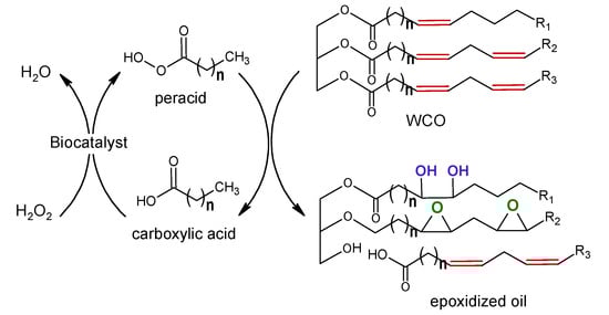 To obtain value-added products that can compete with classical fossil fuel-based solutions (e.g., phthalate plasticizers), further steps, involving chemical modification, are required []. The carbon–carbon double bond in the fatty acid residue is the only reactive moiety that can be more conveniently subjected to the epoxidation reaction. Due to the high reactivity of the oxirane ring, the epoxidized oil can be further functionalized to various designed chemicals. Therefore, the epoxidation step plays an important role in the valorization possibilities of WCO. Despite the fact that this reaction has been intensively studied with edible oils and with epoxidized soybean oil (ESO), as a globally available commercial product, its replacement in the industry is still scarce due to high costs []. However, the use of WCO, the selectively recyclable catalyst and mild conditions for the epoxidation reaction could overcome this obstacle. For this reason, new publications on oil epoxidation are constantly appearing [].
