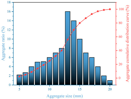Concrete comprises water, cement, fine aggregate, coarse aggregate, and additional materials. The specimen for this study follows the C40 strength standard (C40 is a concrete strength grade with a required compressive strength of 40 MPa after 28 days of curing). For each group of concrete specimens, this study fabricated nine cubes (150 mm × 150 mm × 150 mm) and nine prisms (100 mm × 100 mm × 400 mm). Polypropylene fibers are blended with the aggregate and sand, and cement is introduced. The mixture is stirred, and water is added and thoroughly combined before being poured into molds. Utilized cement is low alkali cement to ensure the alkali content depends on the alkali–aggregate content. The fiber reinforcement used is polypropylene, which is 12 mm long and has a 0.91 g/m3 density [36]. Medium sand, having a fineness modulus of 2.4, serves as the fine aggregate. Four commonly utilized aggregates are selected to be susceptible to ASR and are blended in varying proportions to regulate the extent of ASR in concrete; their basic properties and composition are shown in Table 1 and Table 2. The dosage and the proportion of other raw materials are shown in Table 3. In this case, 30, 60, and 100 represent the alkali–aggregate content, and C, R, B, and G represent crushed stone made of pebble, recycled concrete, basalt, and granite. For example, R30 represents a concrete specimen with recycled concrete with a coarse aggregate content of 30%. Recycled concrete is crushed and screened with discarded concrete test blocks in the laboratory. Figure 1 shows the four chosen coarse aggregates: crushed stone, recycled concrete, basalt, and granite. Figure 2 illustrates that an increase in SiO2 in the coarse aggregate correlates with a higher propensity for these substances in other concrete raw materials to engage in ASR, resulting in more gel precipitation. This kind of gel is an alkali–silica gel. Figure 3 shows particle size distribution curve of aggregate. When the concrete has four conditions, including alkali aggregate, high alkaline solution content, soluble calcium, and specific humidity, ASR will occur, resulting in a chemical reaction between the alkaline solution and active silicon dioxide in the concrete, and finally, the formation of a gel. The reaction equation is as follows: