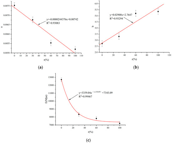 The relationship between parameters and alkali–aggregate content r: (a) variation of parameter a with alkali aggregate; (b) variation of parameter b with alkali aggregate; (c) variation of E with r alkali aggregate.