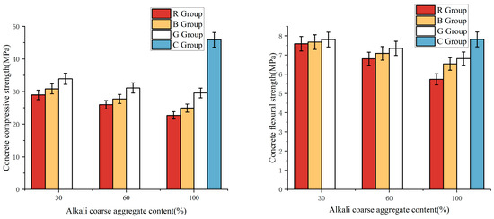 - An increase in alkali content negatively impacts concrete’s bearing capacity and alters its mechanical properties. Specifically, concrete’s compressive and flexural strengths decrease to varying extents. For instance, when the alkali–aggregate content reaches 100%, the compressive and flexural strengths diminish by 35.5% and 32.9%, respectively.