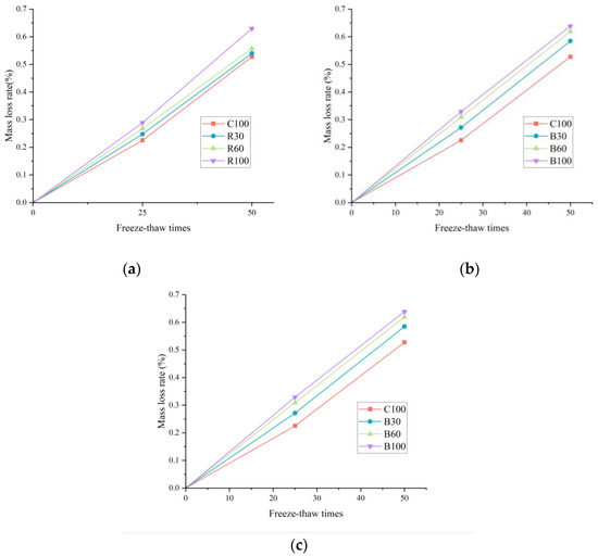 The mass loss rate of concrete: (a) mass loss rate of R group; (b) mass loss rate of B group; (c) mass loss rate of G group.