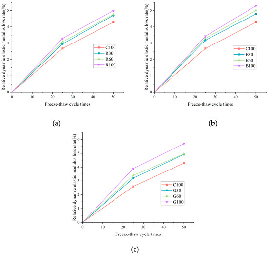 Relative dynamic elastic modulus loss rate of concrete: (a) relative dynamic elastic modulus loss rate of R group; (b) relative dynamic elastic modulus loss rate of B group; (c) relative dynamic elastic modulus loss rate of G group.