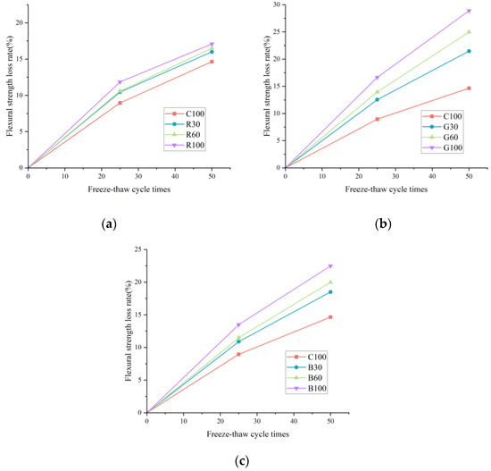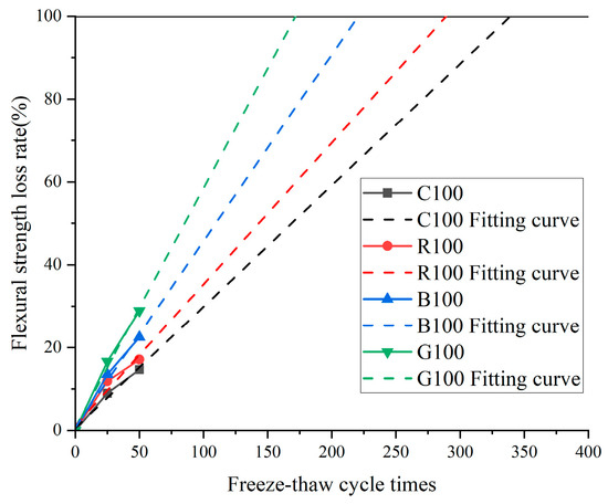 Using Origin’s curve fitting capabilities allowed for a thorough analysis of the flexural strength loss rates, synthesized in Figure 12. The predicted number of freeze–thaw cycles necessary to complete strength depletion for the C100, R100, B100, and G100 samples are approximately 173, 221, 291, and 340 cycles, respectively. This observation, when considered from another angle, affirms that a positive correlation exists between higher alkali content and reduced durability of concrete. The findings underscore the critical role that alkali content plays in the longevity and resilience of concrete structures when subjected to the cyclical stresses of freeze–thaw cycles. The data indicate that concretes with lower alkali content exhibit more excellent resistance to strength deterioration under such conditions, thereby suggesting that careful management and reduction in alkali content could be instrumental in enhancing the durability of concrete and extending its service life.