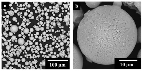 Figure 1a shows almost spherical IN625 powder particles with some sporadic satellites. At high magnification (Figure 1b), IN625 particles revealed a dendritic structure on the surface generated by the elevated cooling rates occurring during the gas-atomization process.