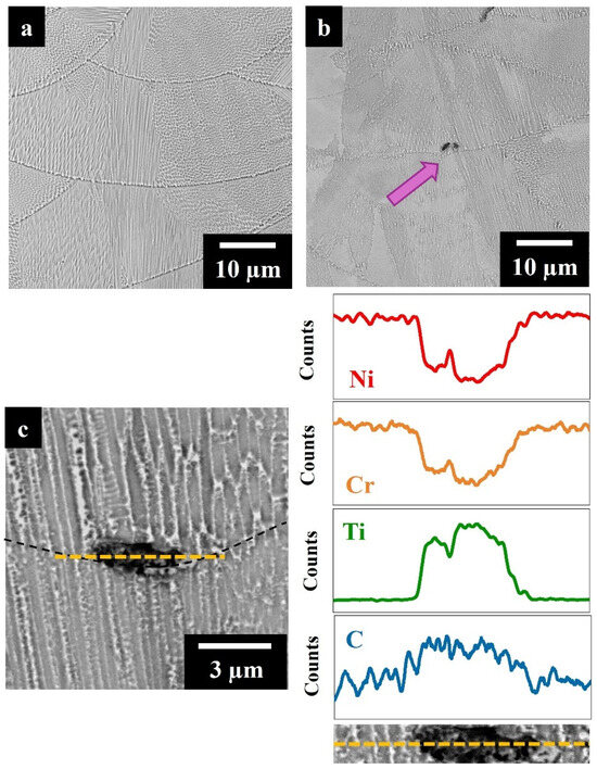 SEM images of (a) IN625 and (b) IN625 + TiC (the pink arrow pointed out a TiC segregation). (c) SEM image focusing on TiC segregation with line EDS analysis.