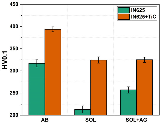 Overall, the microhardness reduction after SOL and SOL + AG is limited for the IN625 + TiC with respect to the IN625 alloy. This could be important for applications at high temperatures since the material retains high hardness in the range of the AB IN625 material.