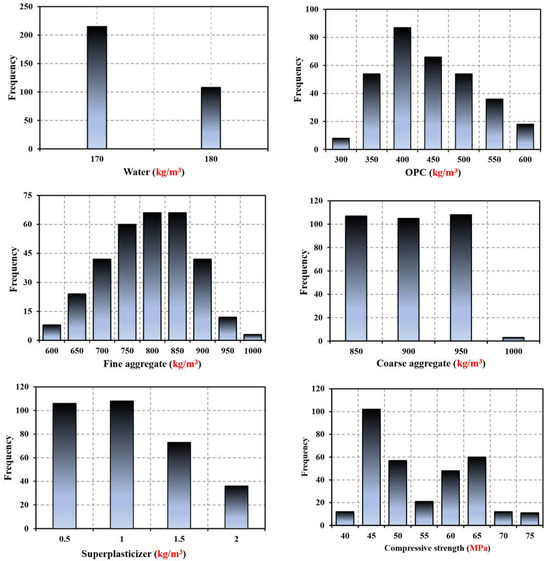 To construct the prediction model, a substantial quantity of empirical data on the compressive strength of concrete is necessary. For this reason, we have compiled a list of 324 concrete compressive strength tests from published research [40,41]. The five components of the tested concrete are fine aggregate (FA), ordinary Portland cement (OPC), superplasticizer (SP), water, and coarse aggregate (CA). There are six parameters in all the experimental datasets. The experimental parameters are listed in Table 1 together with their name, unit, mean, standard deviation (SD), and lowest and maximum values. Furthermore, Figure 1 plots the statistical distribution of the relevant parameters, which enables us to observe the parameters directly.