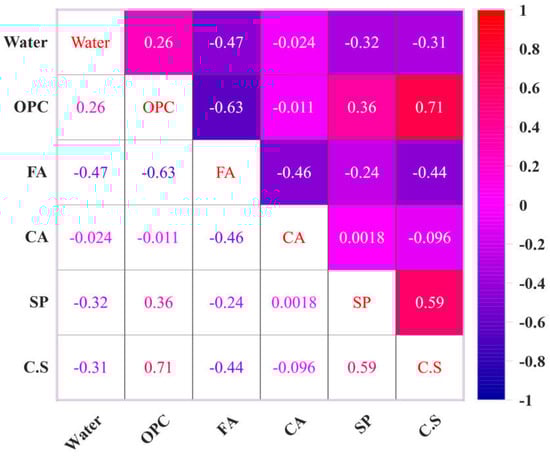 The dataset, which consisted of 324 data samples, was analyzed in this section to develop and test the proposed ANN, RSM, and ANFIS models in this study. Conditions include fine aggregate (FA), ordinary Portland cement (OPC), superplasticizer (SP), water, and coarse aggregate (CA). The model targets concrete compressive strength (MPa). Various configurations of experimental variables were taken into consideration. Supplementary Table S1 presents the results of the various experimental circumstances. Table 1 presents a descriptive statistical analysis of the laboratory-generated dataset to provide information. A variety of standard deviations is shown by the data in Table 1, which in turn aids in the construction of more comprehensive models. The input and target variables’ histogram are displayed in Figure 1. Using Pearson’s linear correlation, we also examine the linear correlation coefficients and their significance levels among the data factors [42]. Figure 2 shows several variable correlations. Linear correlation analysis is often used to discover input variables for modeling the final output, especially if numerous variables are unrelated to the target. Our experiment produced correlation coefficients for the five input variables and targets. The multicollinearity problem occurs when independent variables are highly correlated, resulting in incorrect machine learning model interpretation results [43]. The parameters due to their sensitivity, model parameters can cause large discrepancies between observed and predicted results [44]. Thus, predicted parameters must be precise to predict simulated values. Discovering sensitive factors is a crucial challenge for any statistical investigation. Evaluate sensitively Models created using various technologies were evaluated using statistical markers including R2, R, RMSE, and MAE [45]. The validation and testing of models differ slightly, but new machine learning techniques must estimate them to fully comprehend them. The model’s performance and dependability were assessed using four important parameters [46]. The various performance ratings and their corresponding ranks, which are generally used for purposes of assessment [47]. The following relationship Equation (5) shows how input variables affect procedure outcomes: