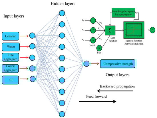 The independent–dependent relationship for mechanical properties can be predicted in several ways [11]. RSM and ANN are two prominent approaches to showing interrelationships [12]. RSM (response surface methodology) and ANN (artificial neural network) approaches are commonly employed for predicting and simulating the properties of concrete materials [13]. Many recent studies have shown that an ANN can solve engineering problems. However, data for forecasting concrete compressive strength is sometimes complex or insufficient [14]. The compressive strength of self-compacting concrete (SCC) including bottom ash was predicted by Siddique et al. [15] using artificial neural networks. Artificial neural network (ANN) models are gradually replacing classic linear models for forecasting concrete properties [16]. ANN models have been utilized in numerous studies to simulate systems that replace sand with fly ash [17,18], silica fume [19,20], metakaolin, and blast furnace slag [20]. Support vector machines (SVM) [17], back-propagation neural networks (BPNNs) [21], genetic programming (GEP) [20], multi-layer perceptron neural networks (MLP-ANN) [22], and artificial neural networks with genetic algorithms (GA-ANN) [19] are just a few of the many other architectures that have also been studied. ANN outperformed XGBoost in recognizing waste marble powder (WMP) content. The XGBoost and ANN models optimized concrete WMP dosages [23]. A lengthy experiment examined whether waste quartz mineral dust (WQMD) [24], supplementary cementitious material (SCM), and waste sawdust (WS) [25] could produce high-efficiency lightweight concrete without cement.