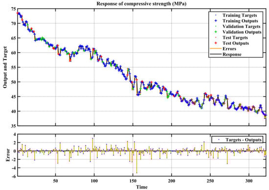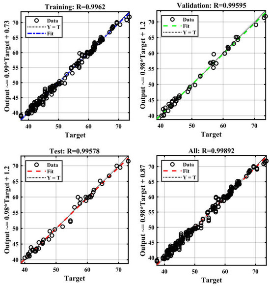 The essential components of Figure 10 are training targets, training outputs, validation targets, validation outputs, test targets, test outputs, errors, and responds. The ability of MATLAB models to understand the link between the input and output parameters and to generalize is demonstrated by the tight match between the output values and target values, as shown in Figure 9. As shown in Figure 10, it is clear that the predicted results are very close to the laboratory results.