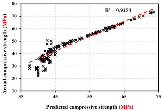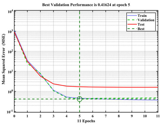 This study involved the construction of an artificial neural network (ANN) to accurately forecast the compressive strength of conventional concrete [50]. The sample was divided into three parts for modeling: 70% was utilized for training, 15% for validation, and the remaining 15% for testing [60]. To mitigate the issue of overfitting, it was shown that enhancements in accuracy on the training dataset were in line with enhancements in accuracy on the validation dataset [67]. To assess the accuracy of the current models, the coefficient of determination (R2) was employed. Higher R2 and a reduced mean square error (MSE) indicate that the model forecasts the compressive strength of concrete with accuracy [68]. Based on the analysis using the ANN technique, Figure 6 displays the R correlation coefficient for training, validation, testing, and cumulative for compressive strength. As shown in Figure 7, the R correlation coefficients of training, validation, testing, and cumulative were 0.997, 0.996, 0.995, and 0.998. In every case where the R-value is higher than 0.9, a strong correlation between the actual and anticipated results is observed [69]. The input variables showed a nonlinear correlation with the model compressive strength prediction. The determination coefficient, R2, is 0.998. Figure 8 displays the network’s optimal validation performance and compressive strength MSE. As demonstrated in Figure 8, it was found that the MSE for the tested scenario in the training and validation datasets saturates with increasing epochs [62]. The 11th iteration of the training process marked the end of the process; however, it is important to remember that at this time, the error was higher than it had been in the fifth iteration for both the validation and testing data. According to this finding, the model may have begun to overfit the training set at iteration 5, as its performance did not improve beyond that point. This means the best time to discontinue using this model is after the fifth iteration. The model reached a minimal MSE of 0.416 at iteration 5. Lower MSE values, when the MSE value is 0, indicate superior performance and a lack of error. Figure 9 displays the ANN model’s training state and details the test termination at epoch 11 and the six-time error repeat after epoch 0. The weights from the first epoch, 0, are taken as the final weights and are considered as the reference point. Since the errors are repeated six times before the procedure is terminated, the validation check is equal to 6. MSE values and R for the compressive strength are shown in Table 3.