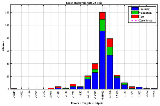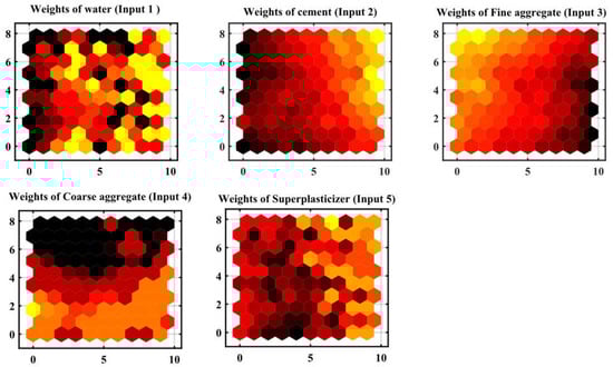 Figure 11 shows error bin distribution to show the difference between actual and expected values. The substantial fraction of the dataset in smaller error bins implies the model’s concrete compressive strength estimates are correct. Based on a comparison of weight vector values for each variable in each map unit, the component planes of the five input variables, as shown in Figure 12, provided excellent assistance in interpreting the clusters obtained. Figure 12 showed low concentrations of water and superplasticizer. However, the main characteristic of these samples showed the highest levels of cement and fine and coarse aggregate. The effectiveness of the ANN model was tested using experimental results. Comparisons included sample size, input, output, and R2 value [70]. Table 4 shows that most researchers utilized similar input factors in this investigation. Data availability and variable significance have led some researchers to employ fewer input variables. Table 4 shows R2 values from 0.67 to 0.994 from the literature. In this analysis, the ANN model had a good R2 value of 0.998, near to the literature values. Compared to earlier models, this shows that the designed model operates at a high degree of accuracy. One difference between this study and others is sample size.
