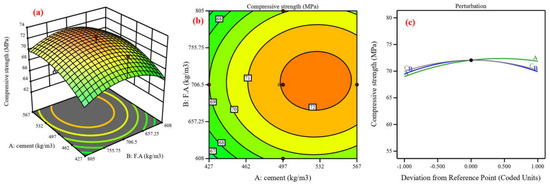 Compressive strength for response 3: (a) 3D view, (b) contour graph, and (c) perturbation plot.