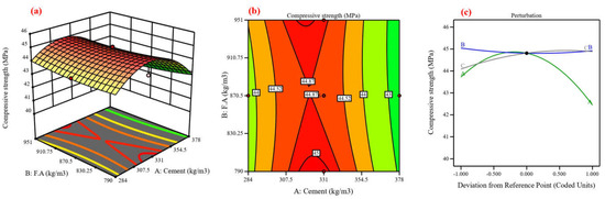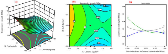 Compressive strength for response 1: (a) 3D view, (b) contour graph, and (c) perturbation plot.