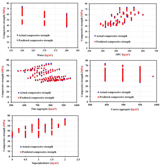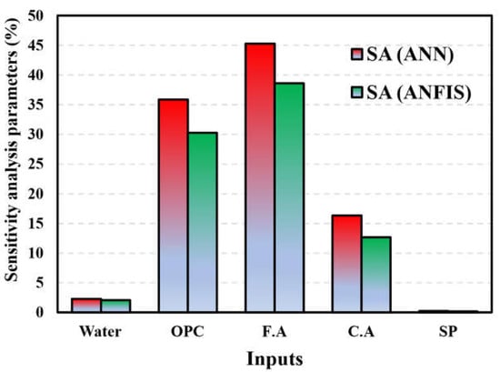 The impact of the input variables on the output variables of the dataset was evaluated using sensitivity analysis (SA). Quantifying the relationship between uncertainty in a model’s inputs and outputs can be achieved using several techniques provided by SA [75]. The SA normally evaluates how sensitive the model is to parameter and data uncertainty. Input variables affect output variables more with higher SA values [100]. SA linked ML model outcomes to input variable count and dataset. As illustrated in Figure 20, the correlation coefficients of all input variable combinations were determined to eliminate multicollinearity. As the cement content and fine aggregate are increased, the concrete compression strength increases, as shown in Figure 20, and OPC showed a greater correlation coefficient than the other variables. The correlation coefficients of CA, water, OPC, FA, and SP were −0.31, −0.72, −0.45, −0.093, and −0.59, respectively. These parameters significantly decreased the compressive strength of the concrete, with cement being the most significant factor. The models utilize two scenarios since the ANN, RSM, and ANFIS models will include/exclude various independent variables because of the significant correlation between “fine aggregate” and “coarse aggregate” [92]. Figure 21 illustrates how input parameters affect the estimate of the ANN’s compression strength. sensitivity analysis revealed that the OPC, which accounted for 45.29% of the total impact, was the most important component [100]. The fine aggregate came in second at 35.87%, and the coarse aggregate at 15.35%. These results agree with the findings of previous research [93].