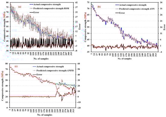 The fuzzy inference system in the current work is created using the subtraction clustering technique [98]. The type and quantity of membership functions are chosen solely by the hybrid learning strategy, which employs gradient descent and the least-squares method to find a workable set of antecedent and subsequent parameters [99]. The ANFIS model in the current prediction study was developed using the quick learning technique, in conjunction with the Fuzzy Logic Toolbox and MATLAB [26]. The optimum ANFIS architecture was determined using a trial-and-error approach. To minimize inaccuracy, 16 epochs were used during training. The model’s training results reveal the lowest error after 3 epochs and probable convergence after 16 epochs. Figure 19 shows the expected and experimental values of compressive strength. The 324 testing data points have a 0.925 percent correlation. Training error size-wise, expected, and experimental values are near. The research shows that most test results match expected values.
