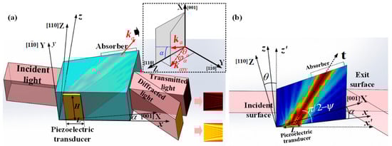 A volume grating is formed in the AO crystal due to the shear acoustic wave traveled inside, which is generated from the vacuum-bonded transducer and absorbed by the sound absorber, as shown in Figure 1a. In the schematic diagram of the AOTF device, we use X, Y, and Z to represent the crystal coordinate [001] axis, axis, and [110] axis, respectively. The x, y, and z axes correspond to the transducer’s coordinate system, with the y-axis coinciding with the Y-axis. The x-axis lies within the transducer plane, forming the transducer cutting angle with the X-axis. The transducer with a length of L and a width of H is bonded on the xy plane. Under ideal acoustic plane-wave assumption, the acoustic field with phase velocity perpendicular to the transducer propagates along the group velocity direction at the transducer’s vibration frequency f and has a uniformly distributed intensity. The t-axis represents the direction of acoustic energy propagation, with a deviation angle of walk-off angle from the phase velocity direction. The walk-off angle is determined by the phase velocity direction and the slowness ellipsoid [].