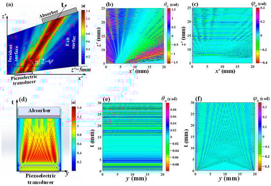 Amplitude and angle distribution of the acoustic field in different cross-sections (a) Amplitude distribution of the acoustic field on the x′z′ plane; (b) Acoustic polar angle distribution of the acoustic field on the x′z′ plane; (c) Acoustic azimuth angle distribution of the acoustic field on the x′z′ plane; (d) Amplitude distribution of the acoustic field on the yt plane; (e) Acoustic polar angle distribution of the acoustic field on the yt plane; (f) Acoustic azimuth angle distribution of the acoustic field on the yt plane.