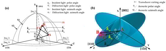 Spatial wave vector diagram in anisotropic crystal. (a) Spatial wave vector matching diagram; (b) Spatial acoustic wave vector diagram.