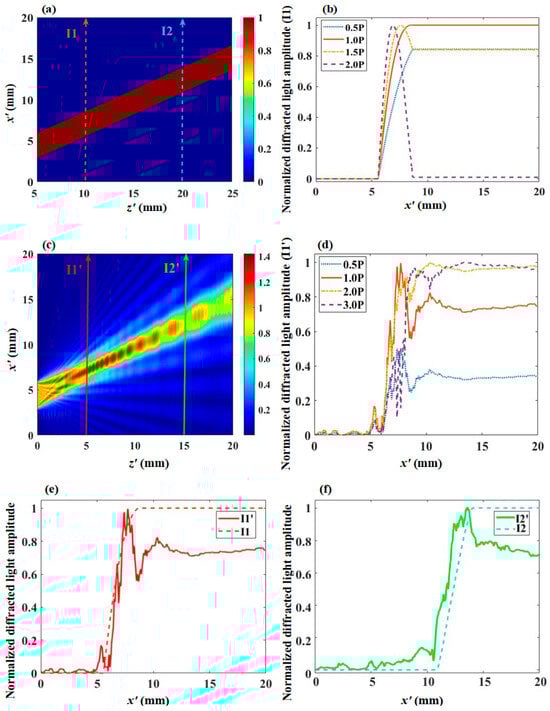 Figure 4e shows the comparison of the diffracted light amplitude curves for light paths I1 and I1′ under the condition of acoustic driving power P. Similarly, Figure 4f shows the comparison of the diffracted light amplitude curves for light paths I2 and I2′ under the condition of acoustic driving power P. The inhomogeneous distribution of the phase and intensity of the acoustic field will cause the AO interaction superposition effects of incident light to be spatially-dependent, so the final amplitudes of the diffracted light of I1′ and I2′ are different, and the normalized diffracted amplitude cannot reach 1, meaning the diffraction efficiency cannot reach 100%. According to Equation (5), the change of the diffraction light amplitude is determined by the exponential term, and determines the magnitude of the change. During the AO interaction process, the diffraction light amplitude is complex. When is positive, the diffraction light amplitude increases; otherwise, the diffraction light amplitude decreases, thus reflecting the energy exchange process between the transmitted light and the diffracted light caused by the inhomogeneous acoustic field distribution.