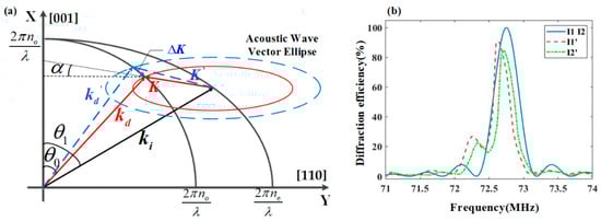 Figure 3a is a schematic diagram of AO coupling at an arbitrary point. Assume that the acoustic wave vector perpendicular to the transducer satisfy the momentum matching with the incident wave vector and diffractive wave vector . However, due to the inhomogeneous distribution of the acoustic field, the wave vector exists, resulting in the momentum mismatching [,]. The acoustic wave vectors , and momentum mismatching on the acoustic wave vector surface [] are shown in Figure 3b. Under ideal acoustic field conditions, only the wave vector exists; the endpoint of the acoustic wave vector will only exist at point B on the wave vector surface in Figure 3b, where the acoustic-optic momentum matching is considered to be achieved. However, in a non-uniform acoustic field, the endpoints of the wave vectors will be distributed around point B, with the wave vectors in the surrounding area of point B being in a momentum mismatch state. In this paper, we only consider the influence of the momentum mismatching on the diffracted light intensity, assuming it has no effect on the direction of the diffracted light. Solving in Figure 3 yields