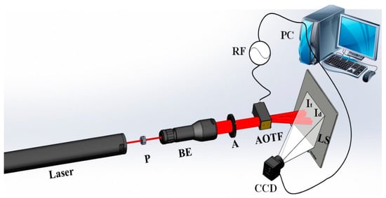 In order to verify the method proposed, an optical path is set up as shown in Figure 6 to observe the optimal frequency variation. A 632.8 nm wavelength He-Ne laser (Daheng Optics, Beijing, China) is polarized to extraordinary light by polarizer P (Thorlabs, Newton, NJ, USA). After passing through beam expander BE (Thorlabs, Newton, NJ, USA) and aperture A(Daheng Optics, Beijing, China), a collimated incident light is obtained. After AO diffraction by the AOTF(China Electronics Technology Group Corporation, Chongqing, China), it is divided into transmitted light and diffracted light . The CCD captures the transmitted light and diffracted light on the light screen LS, and the computer PC jointly controls the frequency switching of the AOTF and the data acquisition of the CCD(Basler, Arensburg, Germany).