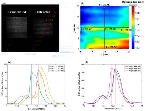The frequency response curves corresponding to I1, I2, I1′, and I2′ in Figure 4 are presented in Figure 5b. Here, I1 and I2 correspond to ideal acoustic field conditions, where their frequency response curves are identical and symmetrical with the center frequency of 72.75 MHz. In contrast, I1′ and I2′ correspond to non-uniform acoustic field conditions, where their frequency response curves exhibit asymmetrical side lobes. When the diffraction efficiency at the central frequencies of I1 and I2 reaches 100%, the corresponding diffraction efficiencies at the optimal frequencies of I1′ and I2′ are 55.8% and 50.4%, respectively. Due to the non-uniform acoustic field distribution, the center frequencies corresponding to I1′ and I2′ are different from the center frequency under ideal acoustic field conditions.