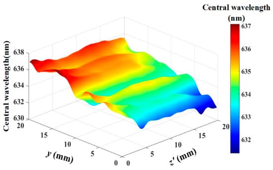 Using Equation (9) to estimate the distribution of the center wavelength within the optical aperture, as shown in Figure 8. The center wavelength distribution ranges from 631.38 nm to 637.07 nm and exhibits an asymmetrical distribution within the optical aperture. This is one of the reasons that the spectral bandwidth of the imaging system is broader than that of the AOTF device.