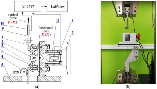 (a) Diagram and (b) view of the testing device: 1, 2, 3—working rollers; 4—support roller; 5—body; 6—sample; 7—nut; 8—horizontal tension cell; 9—upper tension cell; 10, 11—load cells.
