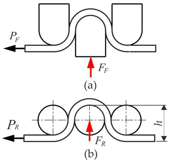 The value of the coefficient of friction is determined based on the values of horizontal and vertical forces that are recorded during tests with freely rotating and fixed rollers. Load cell sensors are placed on the horizontal tension cell and the upper tension cell (Figure 2a). During the test, the signal values from these sensors were recorded using the NI 9237 measurement card (National Instruments Xorporation, Austin, TX, USA) and the Lab View DAQ program (National Instruments Corporation, ver. 2015 SP1, Austin, TX, USA), with a frequency of 50 Hz. The diagram of the force parameters is shown in Figure 3. The tests were carried out for different heights of the drawbead h, as follows: 18 mm, 12 mm and 6 mm. The value of the coefficient of friction was determined from the following equation [67]: