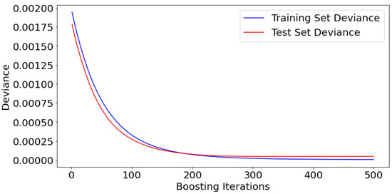 As stated, 500 iterations were tuned to obtain the optimal R2 and minimum mean-squared error. Undoubtedly, augmenting the number of iterations may enhance accuracy, but at the cost of time, and there is a possibility of the model experiencing overfitting. Within this analysis, 500 iterations were conducted, which proved to be very effective in reaching optimal performance, as seen in Figure 4. Stability was achieved after around 300 iterations, with a slight decrease in MSE that is nearly insignificant in the final 200 iterations.