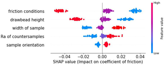 The present study analyzes the influence of parameter features, specifically referred to as Features Importance or relative importance, on the coefficient of friction, which is the output variable. As stated before, the experimental study included five parameters, which were employed as inputs. The Features Importance of the parameters is shown in Figure 6. The input parameter ‘Friction conditions’, as a categorical variable, is responsible for the lubrication conditions, i.e., it assumes one of the three following states: dry friction, lubrication using LAN-46 machine oil (Orlen Oil, Kraków, Poland) and lubrication using Heavy-Draw 1150 stamping oil (Lamson Oil, Rockford, IL, USA). The friction condition during experiments, consisting of three conditions (dry, using oil LAN-46 and using oil HD1150), had the most significant influence on the coefficient of friction (COF), followed by the drawbead height and the sample width. Lubrication conditions (dry friction or lubrication) play a key role in the phenomena occurring in the contact zone in sheet metal forming [74,75]. The use of liquid lubricants is a basic and effective way to reduce friction. Lubricant is used to separate rubbing surfaces by forming a continuous film at the contact interface. In this way, the mechanical cooperation of the surface asperities is limited, among others, through the mechanisms of flattening or ploughing [76]. Drawbead height determines the change in the topography of the sheet metal surface caused by repeated bending and straightening of the sheet when the sheet passes through the drawbead. Moreover, DC04 steel sheets have a high tendency to work hardening [77,78]. Therefore, large deformations of the sheet material change their strength and hardness at the same time. In this way, there is a change in the friction conditions, resulting from a change in the mechanical properties of one of the bodies of the friction pair. The width of the sample influences the character of the deformation of the sheet metal while passing through the drawbead. Therefore, there is a different intensity of frictional cooperation between the sheet and the countersamples across the width of the sheet strip [64]. This also affects the value and mutual relationship between the values of force parameters, which, according to Equation (1), are the basis for determining the value of the coefficient of friction.
