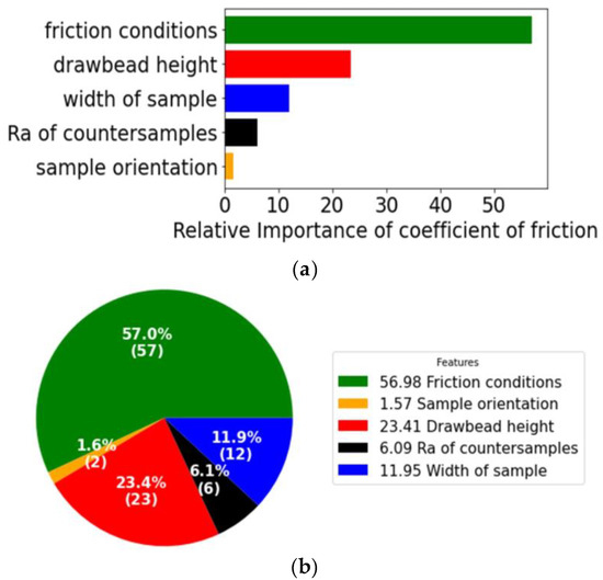 The influence of the surface roughness of the countersamples was minimal. Lastly, the sample orientation had a minimal influence on the COF. Figure 6b displays the percentage of influence of several parameter features. The friction condition feature has the most influence, at 56.98%, followed by drawbead height, at 23.41%, sample width, at 11.95%, surface roughness of countersamples, at 6.09%, and sample orientation, at 1.57%.
