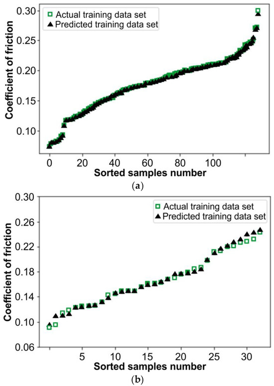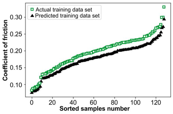 Figure 7 illustrates the actual and predicted values of the COF. The X-axis shows the number of values, while the Y-axis reflects the value of the COF. The values are sorted in ascending order to prevent displaying the data in a skewed manner. However, it is not feasible to see the behavior of the predicted values if they align with the actual values and if they are not sorted. Figure 7a displays the actual and predicted COF values used for the training dataset of the model, whereas Figure 7b shows the data that were retained and not used in the training to be used for testing the model, known as the testing dataset. However, the data in Figure 8 correspond to the data in Figure 7a, with the exception that all the actual training values have been adjusted by 0.1 in the plot to differentiate between actual and predicted values. This adjustment was made because the predicted data in Figure 7a completely matched some of the actual training data, causing them not to be visible.
